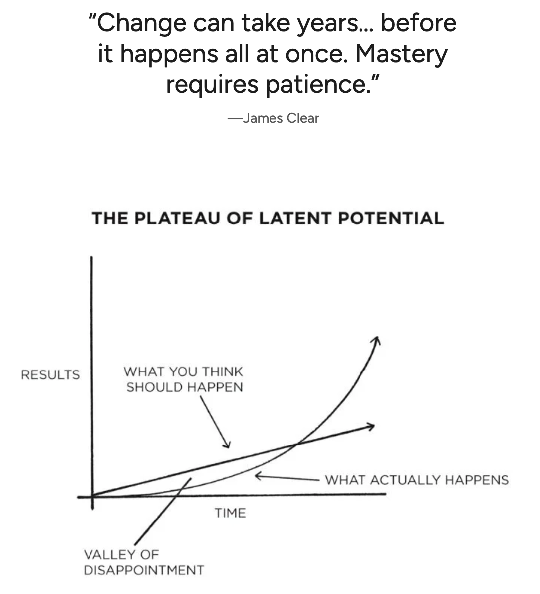 The Plateau of Latent Potential is the theory that describes the frustrating gap between consistent effort and visible results. You grind away at the fundamentals—day after day, year after year—yet progress feels invisible. Expectations rise linearly, but reality builds slowly beneath the surface until it finally breaks through in an unbelievable moment (Ex: Martínez winning the World Cup).